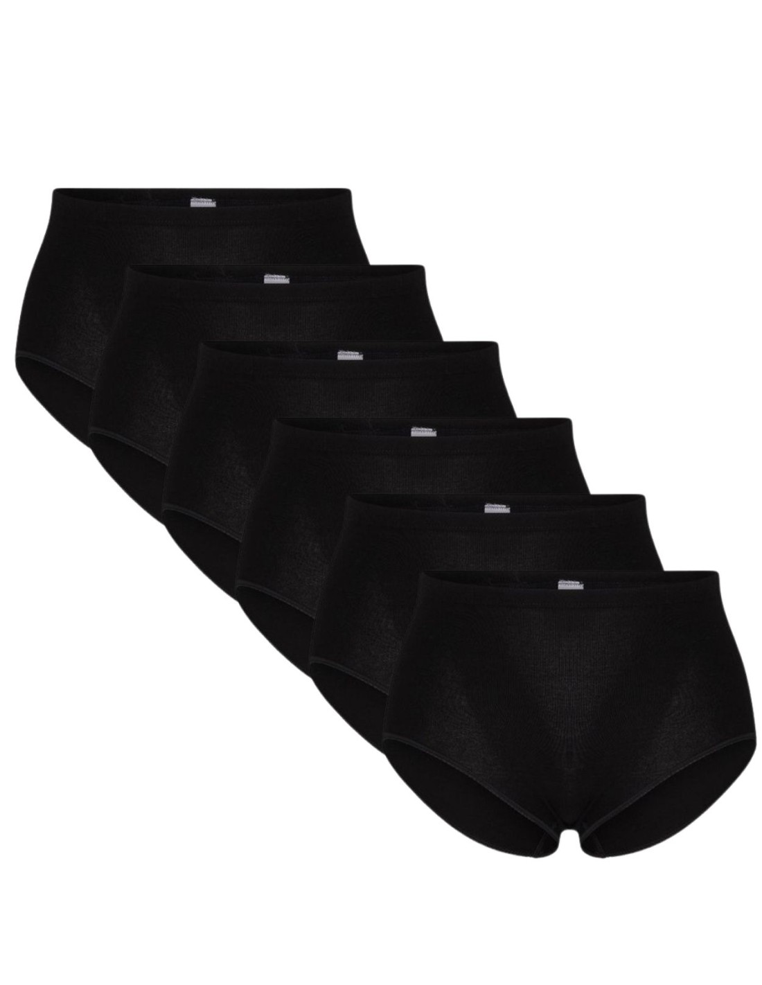 Beeren Dames heupslip (Midi) Briljant 6Pack Zwart. Elastische dames heupslip, gemaakt van een fijnrib, zonder zijnaden. De pijpen zijn afgezet met een elastisch kantje en de taille is omgezoomd met een tunnelelastiek. De binnenkant van het kruis is ge