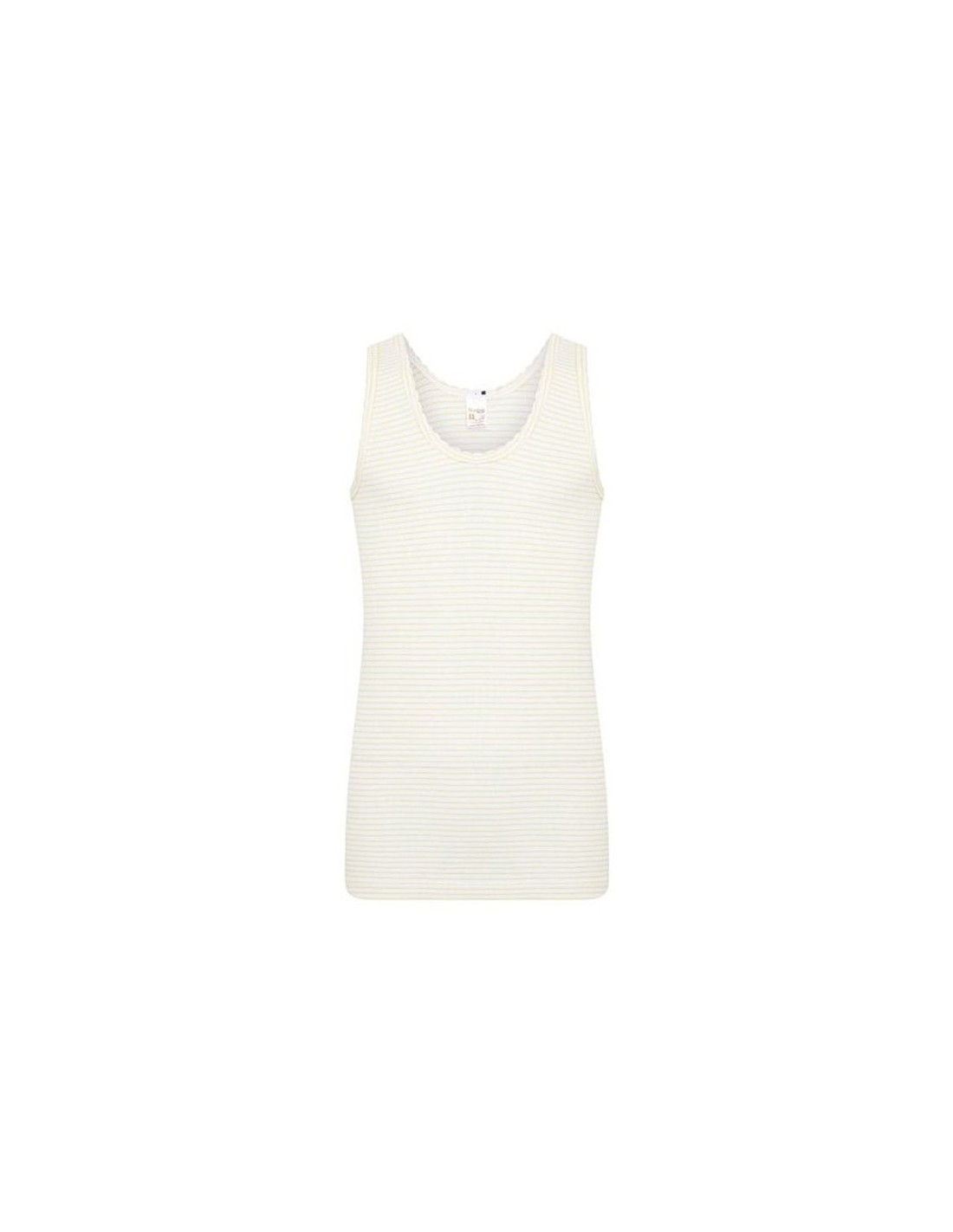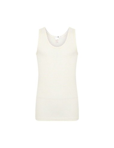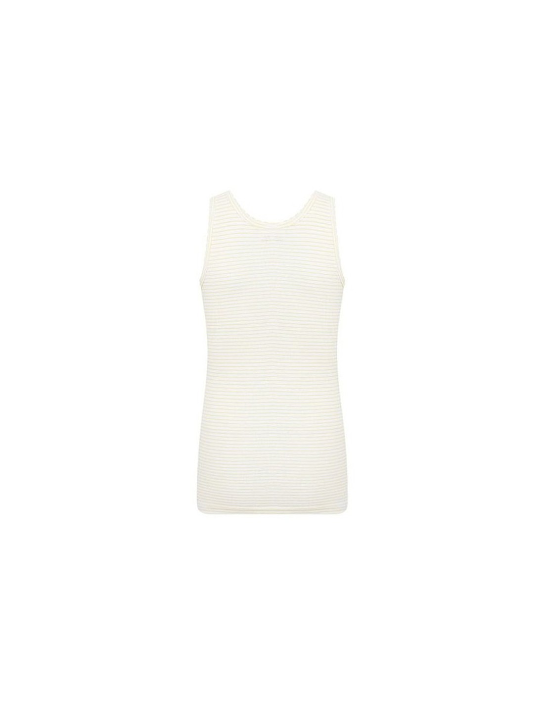 Hemdje zonder zijnaden gemaakt van een fijnrib met een streepdessin. De hals en armsgaten zijn afgezet met een schulp boordje.